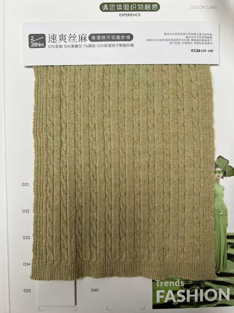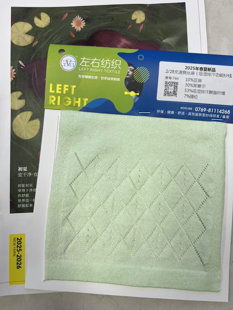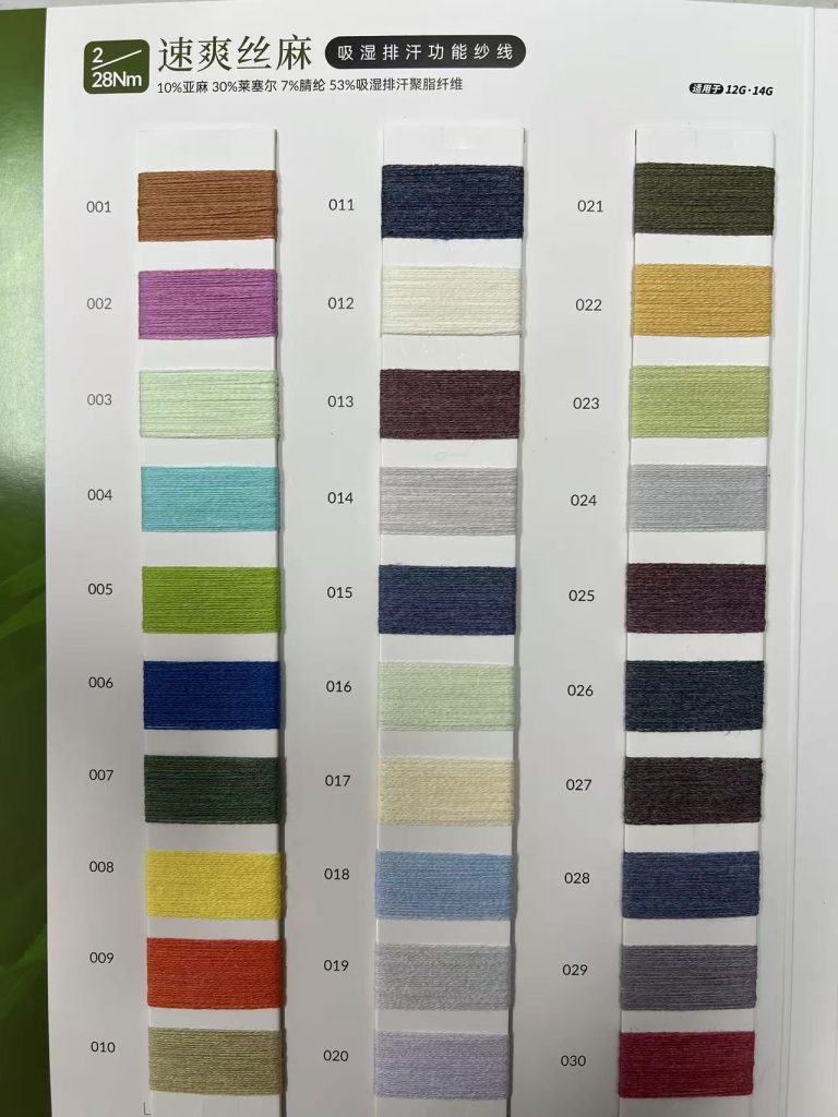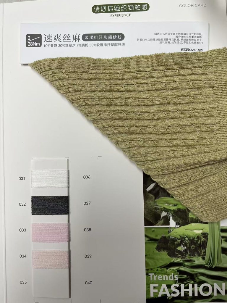 亚麻系列 春夏系列 清爽麻类 2/28 Nm速爽丝麻(吸湿排汗) 来自 zuoyou|已发表 2026年3月23日 10%亚麻 30%莱塞尔7%腈纶53%吸湿排汗聚脂纤维 精选10%法国亚麻天然抑菌且透气如呼吸,融合30%天丝柔滑触感,搭载53%功能性涤纶吸湿排汗且抗皱,赋能面料吸湿速干、透气抗菌、抗皱挺括,春夏的优选素材!