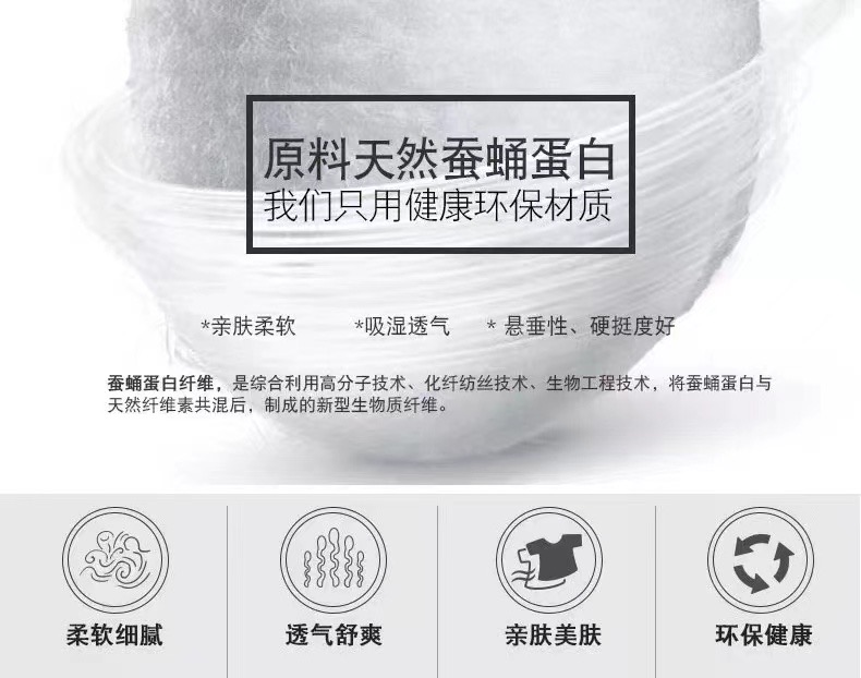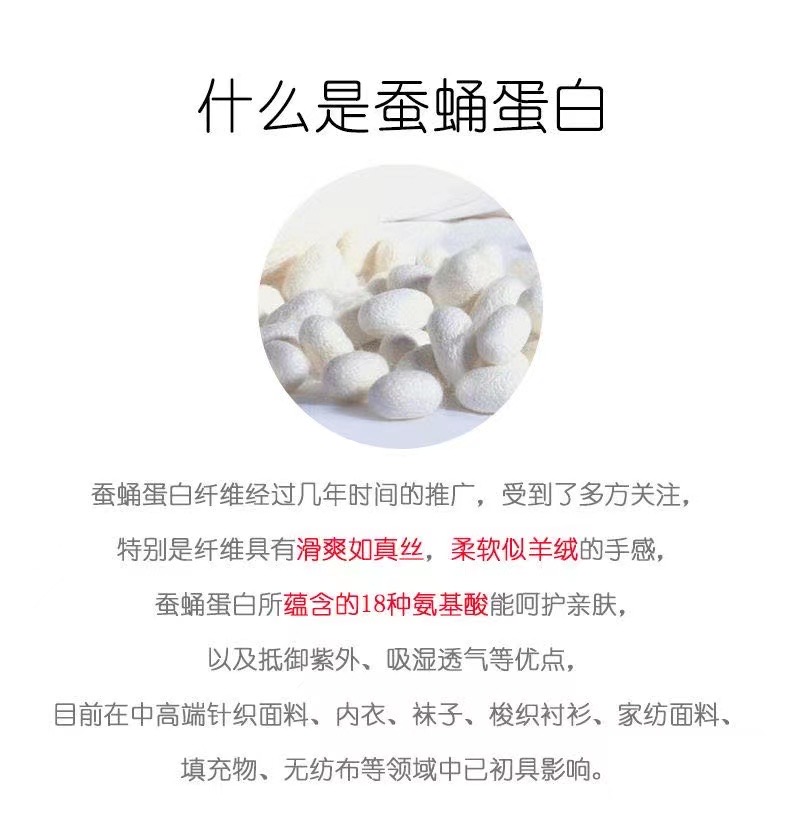 蚕蛹蛋白纤维,是从蚕蛹里萃取蛋白物质与天然植物纤维混纺而成的纤维素纤维,具有桑蚕丝般轻盈、飘逸的外观,羊绒般细腻、柔软的触感。其性能与蚕丝相近,且染色性、悬垂性优于蚕丝。
