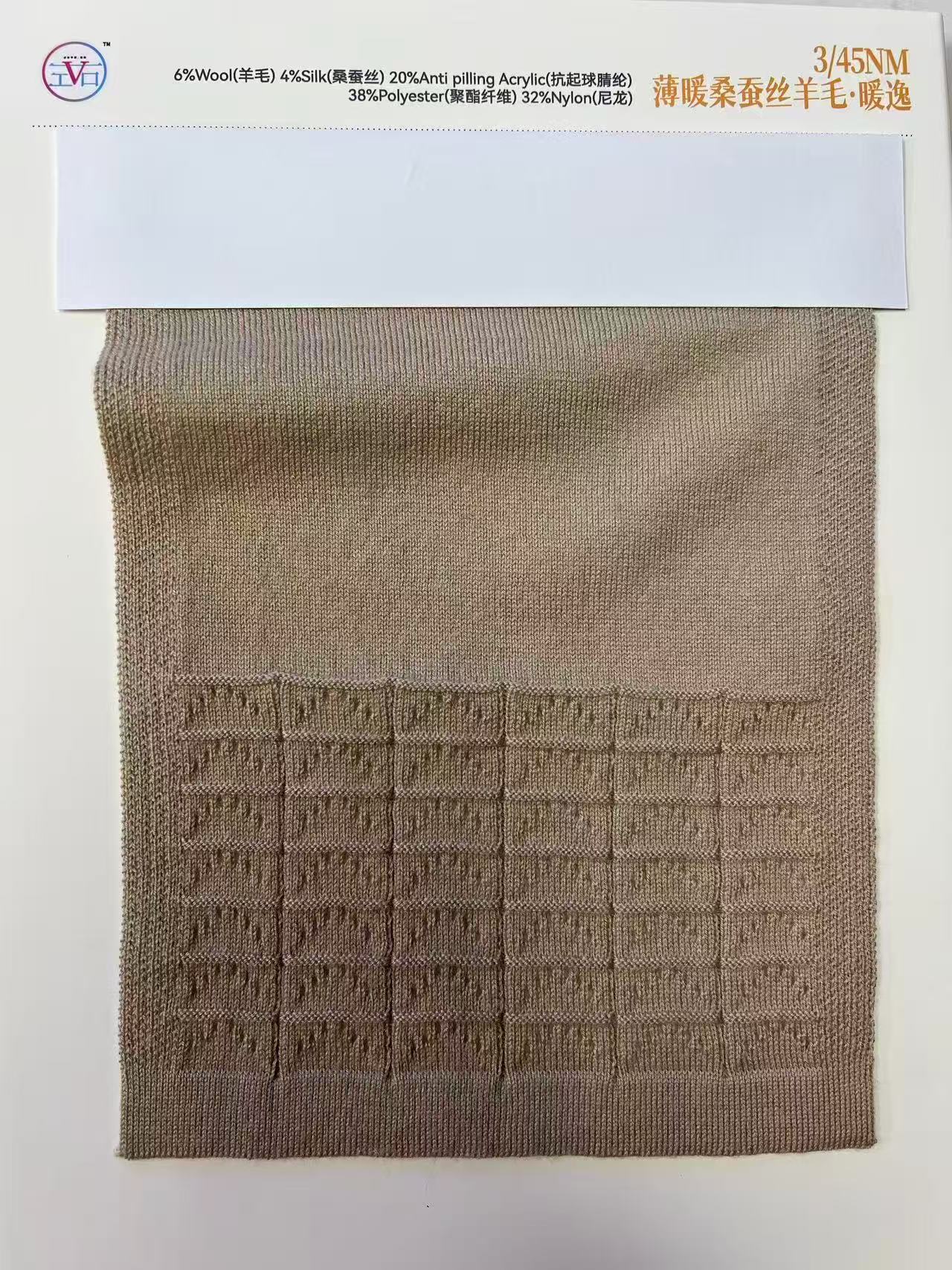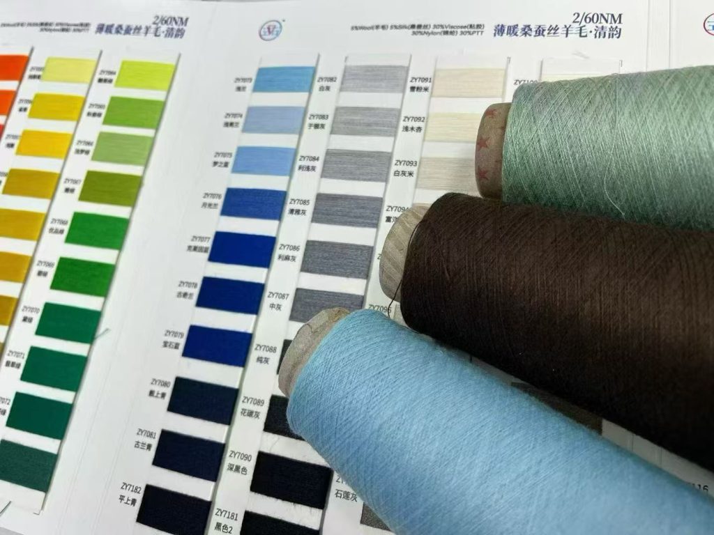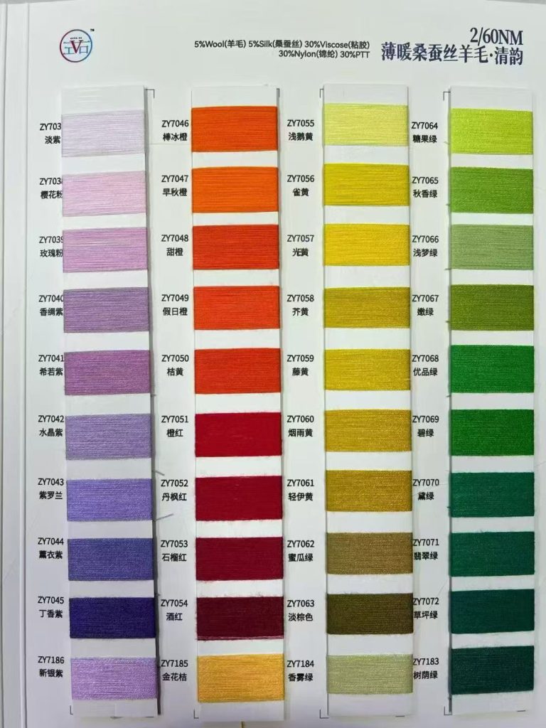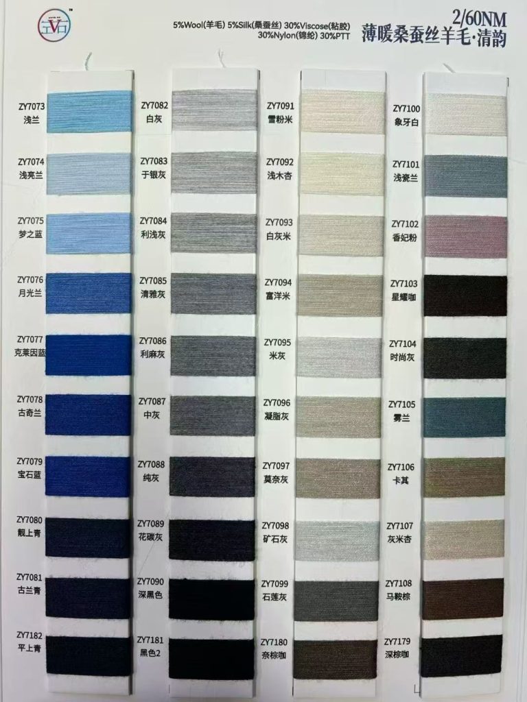 薄暖系列 2/60Nm薄暖桑蚕丝羊毛·清韵 来自 zuoyou|已发表 2026年3月26日 5%桑蚕丝 5%羊毛 30%粘胶 30%锦纶 30%PTT 5% silkworm silk, 5% wool, 30% viscose, 30% nylon, 30% PTT.
